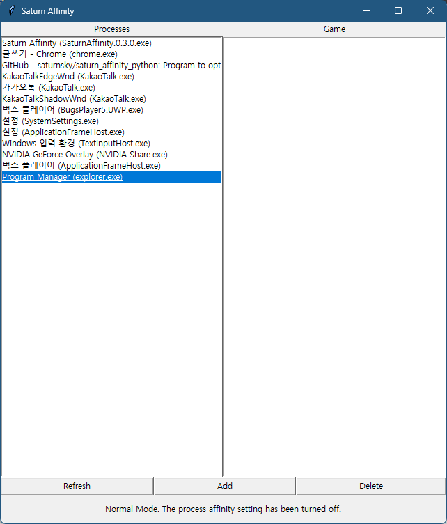 최신 CPU들의 L3 캐시 사용을 최적화하는 툴이라고 합니다. 프로그램 실행 후, Game으로 ADD 눌러주면 됩니다. 게임 목록에 등록된 프로그램에 가장 큰 L3 캐시에 액세스할 수 있는 코어에 할당해준다고 하네요.