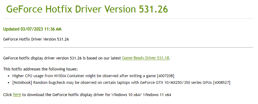 NVIDIA Geforce Hotfix 드라이버 531.26출시 2023.03.08 23:34 PC.Div.Soft/Driver.Firmware 반응형 NVIDIA가 NVIDIA 컨테이너의 높은 CPU 사용량 문제와 특정 노트북에서의 버그 수정 등을 위해 핫픽스(정식 릴리즈가 아닌 문제 수정용 드라이버)를 배포합니다. 다만 주기적으로 출시되는 WHQL 드라이버에 비해 검증 시간 등이 짧은 만큼 이전 버전으로 롤백하고 차후 버그가 수정된 정식 버전을 기다리는 것도 한 방법이지 않나 싶습니다. 핫픽스 드라이버는 여기서 다운로드할 수 있습니다. 반응형 공유하기 게시글 관리 Klein Berry 'PC.Div.Soft > Driver.Firmware' 카테고리의 다른 글 Crucial MX500 SSD 펌웨어 업데이트 페이지 (0) 2023.03.13 인텔의 이더넷 끊김에 대한 해결방법이 효과가 없음 (0) 2023.03.05 NVIDIA, RTX Video Super Resolution 지원 드라이버 배포 (0) 2023.03.01 댓글 공유하기 다른 글 댓글 이 글 공유하기 구독하기 구독하기 카카오톡 카카오톡 라인 라인 트위터 트위터 Facebook Facebook 카카오스토리 카카오스토리 밴드 밴드 네이버 블로그 네이버 블로그 Pocket Pocket Evernote Evernote 다른 글 SK Hynix SSD 관리 툴 다운로드 페이지 SK Hynix SSD 관리 툴 다운로드 페이지 2023.03.13 Crucial MX500 SSD 펌웨어 업데이트 페이지 Crucial MX500 SSD 펌웨어 업데이트 페이지 2023.03.13 인텔의 이더넷 끊김에 대한 해결방법이 효과가 없음 인텔의 이더넷 끊김에 대한 해결방법이 효과가 없음 2023.03.05 NVIDIA, RTX Video Super Resolution 지원 드라이버 배포 NVIDIA, RTX Video Super Resolution 지원 드라이버 배포 2023.03.01 다른 글 더 둘러보기