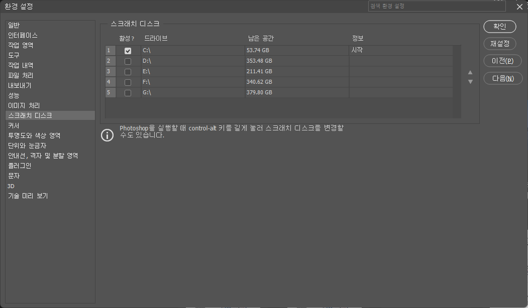 지울 데이터가 없어 용량 확보가 어렵다면 외장 하드, 외장 SSD등을 USB 포트에 꼽고 포토샵의 [편집] > 설정 > 스크래치 디스크 메뉴에서 추가로 드라이브를 잡아주도록 합시다.