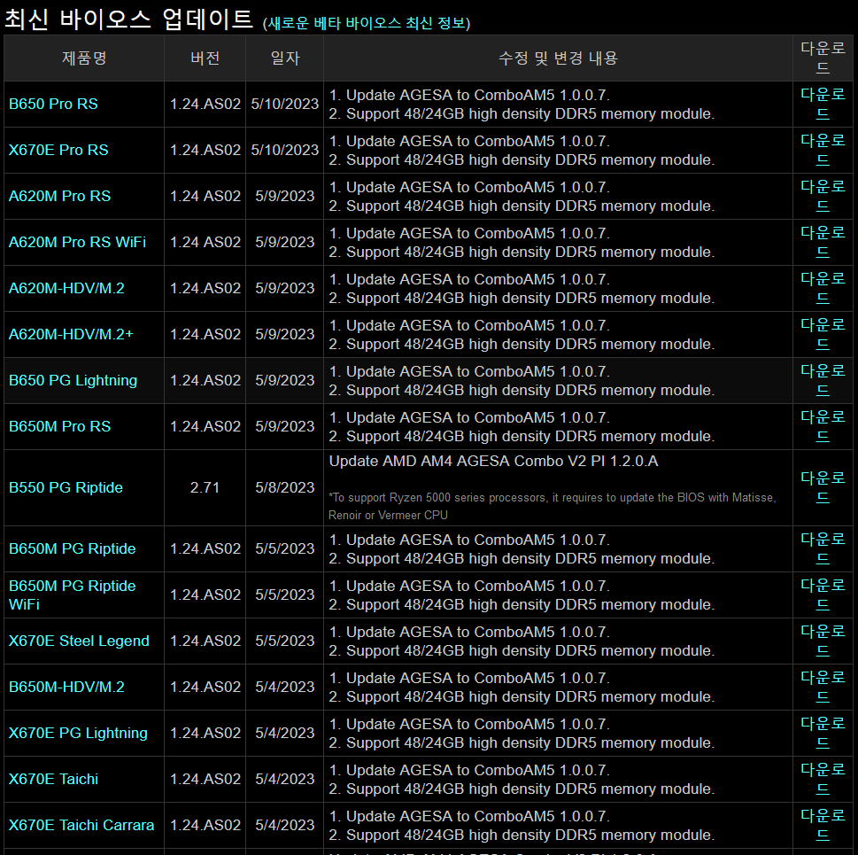 ASRock, 자사 AMD 600시리즈 칩셋 기반 머더보드 BIOS 업데이트 2023.05.10 22:20 PC.Div.Soft/Driver.Firmware 반응형 ASRock이 자사의 AMD 600시리즈 기반 머더보드에 AGESA ComboAM5 1.2.0.7 기반의 BIOS 업데이트와 24/48GB 메모리 모듈을 지원하는 BIOS를 업데이트하였습니다. AGESA 1.2.0.7 버전은 7000X3D 제품군 관련한 과전압 문제 등이 수정된 버전이라 알려진 만큼, 사용하시는 분들은 업데이트를 챙겨보시기 바래요. 반응형 공유하기 게시글 관리 Klein Berry 'PC.Div.Soft > Driver.Firmware' 카테고리의 다른 글 HP, 자사 노트북에 보안 업데이트 제공 (0) 2023.06.01 솔리다임(Solidigm), Eynergy 2.0 커스텀 드라이버로 성능 향상 (0) 2023.05.05 AMD Software Adrenalin ED 22.40.51.06, 블렌더 RT 지원 (0) 2023.05.05 댓글 공유하기 다른 글 댓글 이 글 공유하기 구독하기 구독하기 카카오톡 카카오톡 라인 라인 트위터 트위터 Facebook Facebook 카카오스토리 카카오스토리 밴드 밴드 네이버 블로그 네이버 블로그 Pocket Pocket Evernote Evernote 다른 글 MSI C5M-R5 BIOS 업데이트 MSI C5M-R5 BIOS 업데이트 2023.06.04 HP, 자사 노트북에 보안 업데이트 제공 HP, 자사 노트북에 보안 업데이트 제공 2023.06.01 솔리다임(Solidigm), Eynergy 2.0 커스텀 드라이버로 성능 향상 솔리다임(Solidigm), Eynergy 2.0 커스텀 드라이버로 성능 향상 2023.05.05 AMD Software Adrenalin ED 22.40.51.06, 블렌더 RT 지원 AMD Software Adrenalin ED 22.40.51.06, 블렌더 RT 지원 2023.05.05 다른 글 더 둘러보기