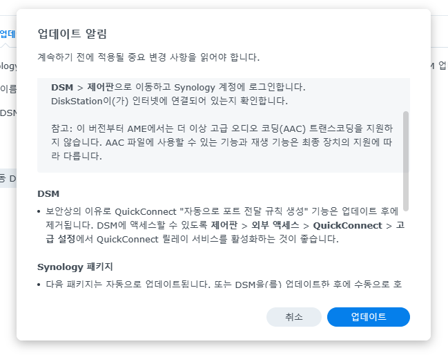Synology, DSM 7.2 정식 출시 2023.05.23 23:56 ETC.Mobile/Nas.HomeLab 반응형 다운로드 페이지에서 NAS > 제품 선택후 드롭 다운 메뉴에서 7.2(64561)를 선택하시면 다운로드해서 업데이트할 수 있습니다. DSM 7.2로 업데이트한 후에는 이전 DSM 버전으로는 다운그레이드할 수 없으며, 퀵 커넥트 고급 설정에서 자동으로 포트 전달 규칙 생성 등의 옵션이 제거되는 등 몇가지 변경사항이 있으니 자기가 사용하는 모델의 변경 로그를 잘 살펴보시기 바래요. 반응형 공유하기 게시글 관리 Klein Berry 'ETC.Mobile > Nas.HomeLab' 카테고리의 다른 글 Synology, DiskStation DS224+ 및 DS124 공개 (0) 2023.07.27 Synology DSM 7.2 RC 다운로드 가능 (0) 2023.05.05 Synology DSM 7.1.1 Upate 3 출시 (0) 2022.12.15 댓글 공유하기 다른 글 댓글 이 글 공유하기 구독하기 구독하기 카카오톡 카카오톡 라인 라인 트위터 트위터 Facebook Facebook 카카오스토리 카카오스토리 밴드 밴드 네이버 블로그 네이버 블로그 Pocket Pocket Evernote Evernote 다른 글 Synology DSM 7.2-64570 Update 2 출시 Synology DSM 7.2-64570 Update 2 출시 2023.08.03 Synology, DiskStation DS224+ 및 DS124 공개 Synology, DiskStation DS224+ 및 DS124 공개 2023.07.27 Synology DSM 7.2 RC 다운로드 가능 Synology DSM 7.2 RC 다운로드 가능 2023.05.05 Synology DSM 7.1.1 Upate 3 출시 Synology DSM 7.1.1 Upate 3 출시 2022.12.15 다른 글 더 둘러보기