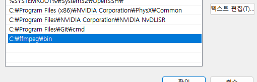 스테이블 디퓨전 설치하는 거 해뒀으면 딱히 해둘 것 없지 않나 싶음. FFMPEG만 받아서 압축푼 뒤, 대충 폴더 정렬해서 bin폴더를 윈도의 path에 넣어주자(검색에서 고급 시스템 설정 보기 입력 > 시스템 속성, 고급탬에서 환경 변수(N)... 클릭 > 시스템 변수(S) 부분에서 Path 찾은 뒤 편집(I) > 새로 만들기(N) 누르고 찾아보기 눌러서 bin폴더 위치 찾아주면 OK).