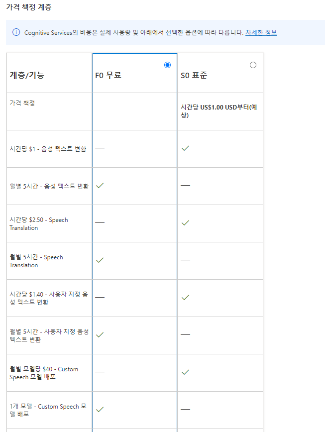 어느 정도의 작업을 어떻게 하느냐....에 따라 달린 거겠지만 생각보다 저렴한 가격에 이런 저런 서비스들 사용할 수 있는 건 좋지 않나 싶다. 사용법은 간단하다. 애저 계정 만들고 > 지역은 Korea Central, 이름은 적당히 긴 이름으로 해두고(영문+숫자+하이픈 ONLY), 가격 책정 계층에서 요금제 종량제 하나 만든 뒤, 만들 때 한국어로 번역이 좀 이상하지만 사용가능 Free 0으로 된 거 선택해주면 됨. 이후 가격 책정 계층에서 F0 무료로 되어있는지 확인하면 OK. 이거 말고도 번역기능 등 생각보다 무료 티어로 개인이 사용하면 쓸만한 것들이 정말 많다; 틈틈히 하나씩 찍먹해보도록 합시다요.