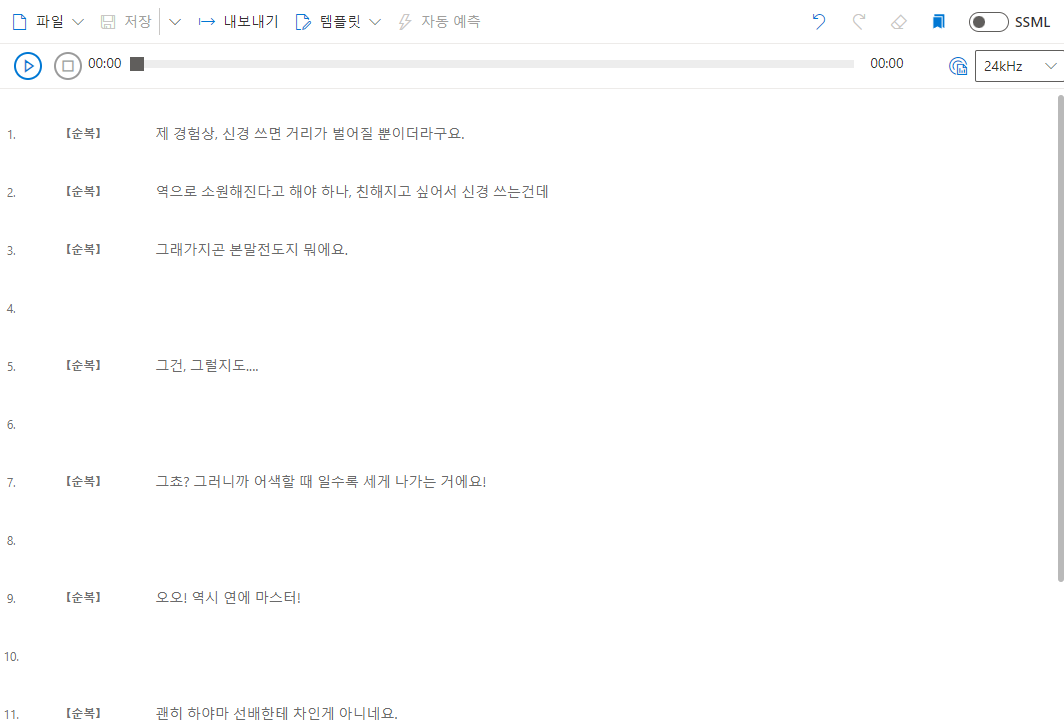 MS 애저 계정으로 무료 요금제를 사용하면 제한적이지만 음성 파일 합성이나 음성 > 텍스트 변환 등을 해볼 수 있다. 텍스트로의 변환은 Whisper쓰는게 더 편하긴 하지만. TTS의 경우 국내라면 KT나 클로바의 음성 합성 서비스가 굉장히 만족도가 높다. MS의 TTS서비스 역시 좋지만, 개인적으론 클로바가 좀 더 매력적이지 않나 싶음. 가격도 크게 부담되는 수준은 아니고. 다만 이정도 퀄리티의 서비스를 무료로 사용할 수 있는 건 MS 애저가 유일하지않나 싶다.