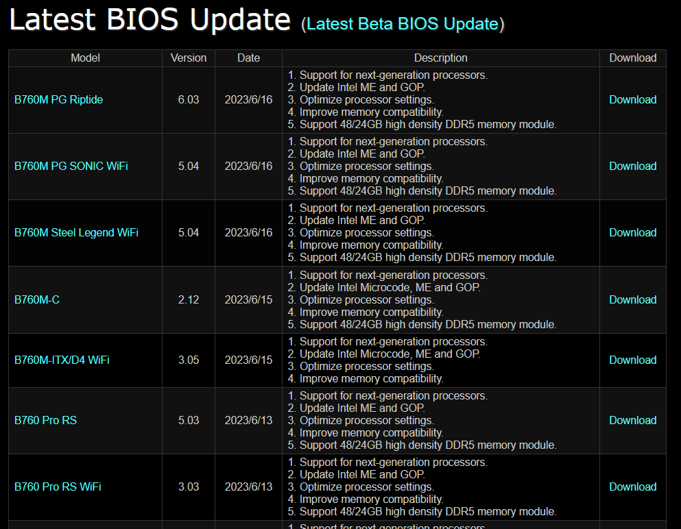 ASRock, 자사 Intel 700시리즈 칩셋 기반 머더보드 BIOS 업데이트 2023.06.19 10:35 PC.Div.Soft/Driver.Firmware 반응형 ASRock 웹페이지에 자사의 Intel 700시리즈 칩셋용 신규 BIOS가 등록되었습니다. 조금 흥미로운 건 차세대 CPU지원 및 ME, GOP 업데이트, 메모리 호환성 증대 및 DDR5 메모리 머더보드에 24/48GB 메모리 모듈 지원이라고 하네요. 사용하시는 분들은 업데이트를 챙겨보시기 바래요. 다만 요즘 ASRock 머더보드의 경우 인스턴트 플래시용으로만 업데이트가 제공되서 조금 아쉽긴 하네요. 반응형 공유하기 게시글 관리 Klein Berry 'PC.Div.Soft > Driver.Firmware' 카테고리의 다른 글 ASUS ROG Ally, 최신 BIOS에서 성능 하락 (0) 2023.06.20 ASUS ROG STRIX X470-I GAMING BIOS 업데이트(5102) (0) 2023.06.19 NVIDIA, GeForce Hotfix Driver Version 536.09 출시 (0) 2023.06.11 댓글 공유하기 다른 글 댓글 이 글 공유하기 구독하기 구독하기 카카오톡 카카오톡 라인 라인 트위터 트위터 Facebook Facebook 카카오스토리 카카오스토리 밴드 밴드 네이버 블로그 네이버 블로그 Pocket Pocket Evernote Evernote 다른 글 HP 225 G9 BIOS 업데이트 HP 225 G9 BIOS 업데이트 2023.06.23 ASUS ROG Ally, 최신 BIOS에서 성능 하락 ASUS ROG Ally, 최신 BIOS에서 성능 하락 2023.06.20 ASUS ROG STRIX X470-I GAMING BIOS 업데이트(5102) ASUS ROG STRIX X470-I GAMING BIOS 업데이트(5102) 2023.06.19 NVIDIA, GeForce Hotfix Driver Version 536.09 출시 NVIDIA, GeForce Hotfix Driver Version 536.09 출시 2023.06.11 다른 글 더 둘러보기