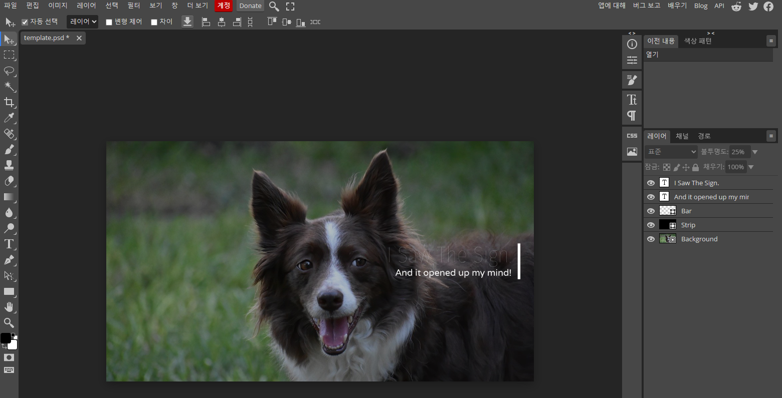 Photopea - 온라인 사진 편집 2023.07.22 01:01 Web.World/Internet 반응형 포토샵과 100% 같을 수는 없지만, 생각보다 쓸만하다. 생각보다 오브젝트 제거 등도 잘되서 급할 때 사용하기 편함. 주소는 여기고, 이미 많은 사람들이 쓰고 있는 듯하다. 다만 온라인 서비스들이 이례 그렇듯 민감한 이미지는 피하도록 합시다. 반응형 공유하기 게시글 관리 Klein Berry 'Web.World > Internet' 카테고리의 다른 글 무료 DDNS 서비스 추천 2곳 (0) 2023.08.13 이미지 확대 사이트 - AVAide (0) 2023.06.25 Slidechef.net - 무료 PPT/GS 템플릿 제공 (0) 2023.05.22 댓글 공유하기 다른 글 댓글 이 글 공유하기 구독하기 구독하기 카카오톡 카카오톡 라인 라인 트위터 트위터 Facebook Facebook 카카오스토리 카카오스토리 밴드 밴드 네이버 블로그 네이버 블로그 Pocket Pocket Evernote Evernote 다른 글 모바일 웨어러블 기기의 스피커 물기 제거 - fixmyspeakrs.com 모바일 웨어러블 기기의 스피커 물기 제거 - fixmyspeakrs.com 2023.08.18 무료 DDNS 서비스 추천 2곳 무료 DDNS 서비스 추천 2곳 2023.08.13 이미지 확대 사이트 - AVAide 이미지 확대 사이트 - AVAide 2023.06.25 Slidechef.net - 무료 PPT/GS 템플릿 제공 Slidechef.net - 무료 PPT/GS 템플릿 제공 2023.05.22 다른 글 더 둘러보기