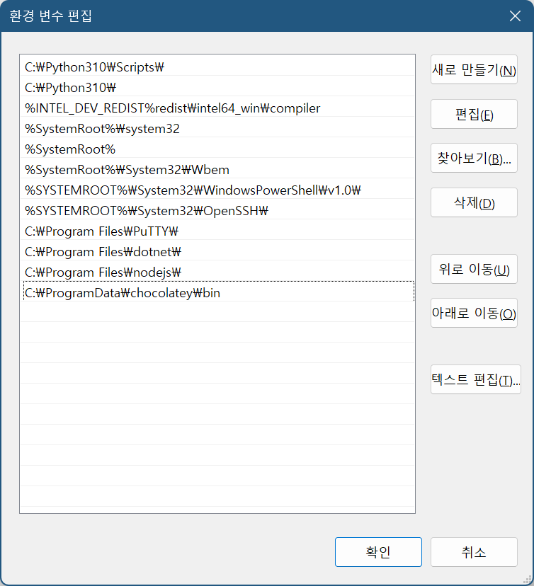 파이썬 패스 추가하기(윈도) 2023.07.24 12:57 PC.Div.Soft/Cloud.Software 반응형 시작 > 시스템 환경 변수 편집(환경 변수라고 검색) > 환경 변수(N) > 시스템 변수(S)에서 Path 찾기 > 편집(I)... > 새로 만들기(N) > 찾아보니 눌러서 패스 추가할 파이썬 폴더와(Python310), 스크립트 폴더(Python310\Scrpts) 모두 추가해주면 되니 참조합시다. 반응형 공유하기 게시글 관리 Klein Berry 'PC.Div.Soft > Cloud.Software' 카테고리의 다른 글 비트워든 - 비밀번호 관리 소프트웨어 (0) 2023.09.11 WinRAR 6.20 출시 (0) 2023.01.23 VMware Fusion 22H2 테크 프리뷰 릴리즈 (0) 2022.08.01 댓글 공유하기 다른 글 댓글 이 글 공유하기 구독하기 구독하기 카카오톡 카카오톡 라인 라인 트위터 트위터 Facebook Facebook 카카오스토리 카카오스토리 밴드 밴드 네이버 블로그 네이버 블로그 Pocket Pocket Evernote Evernote 다른 글 코드 서버: VS Code를 웹서버 형태로 사용하기 코드 서버: VS Code를 웹서버 형태로 사용하기 2023.09.11 비트워든 - 비밀번호 관리 소프트웨어 비트워든 - 비밀번호 관리 소프트웨어 2023.09.11 WinRAR 6.20 출시 WinRAR 6.20 출시 2023.01.23 VMware Fusion 22H2 테크 프리뷰 릴리즈 VMware Fusion 22H2 테크 프리뷰 릴리즈 2022.08.01 다른 글 더 둘러보기