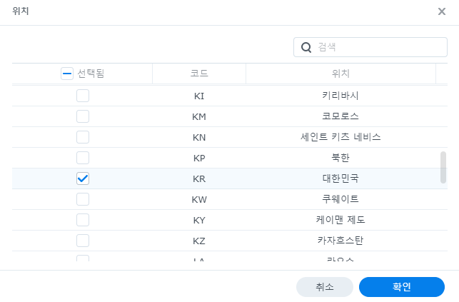 위치를 눌러서 대한민국(KR)만 선택하고, 나머지는 선택 해제해 줍시다.