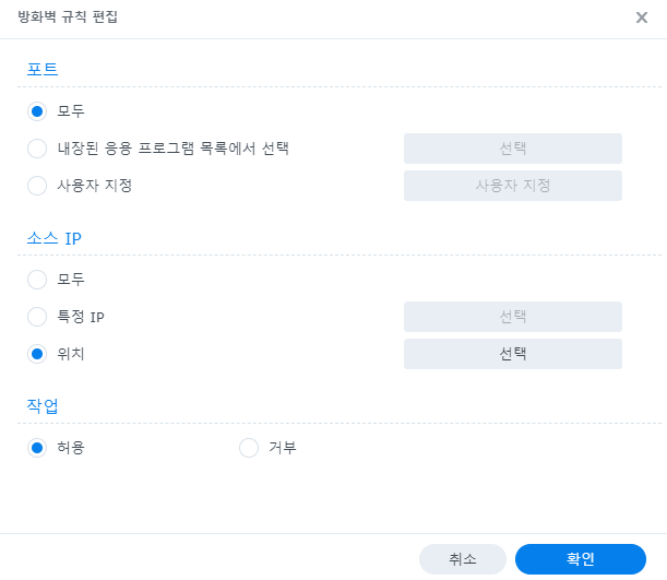 생성 버튼을 누르면 나오는 방화벽 규칙 편집에서 포트는 설정할 게 없다면 그냥 모두로 두고, 소스 IP를 위치로 선택, 작업은 허용으로 두면 된다(특정 국가의 IP범위만 허용하겠다는 이야기). 이 국가의 IP 범위를 차단하고 싶으면 작업 부분에서 거부를 선택하면 된다.