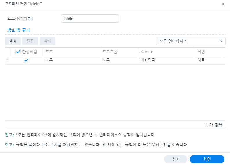 DSM 관리 페이지 접속 > 제어판 > 보안 > 방화벽에서 방화벽 활성화를 체크해서 방화벽 기능을 켜고, 방화벽 프로파일 부분에서 방화벽 프로파일 관리를 눌러 방화벽 프로필(프로파일)을 하나 생성해주자. 만약 국내 IP를 차단하고, 일부 IP(자신의 장치)만 허용하고 싶다면 접속을 허용할 IP만 두고 다 막아주면 되는데, 상세한 내용 여기를 참조하자.