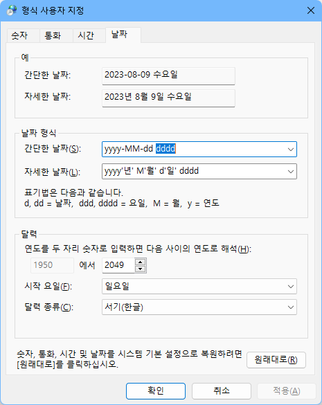 그 외에 평소에도 요일을 표시하고 싶으면 제어판 > 시계 및 국가 > 국가 또는 지역에서 날짜, 시간 또는 숫자 형식 변경을 클릭해서 [형식]탭의 아래 추가 설정(D)... 눌러 형식 사용자 지정 대화상자를 불러오자.