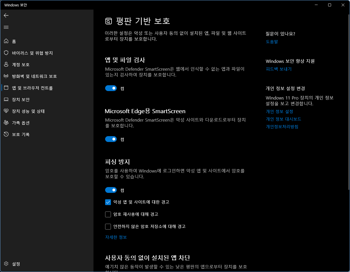 아무튼 이런 평판 기반 보호 설정을 끄기 위해선 설정 > 개인 정보 및 보안 > Windows 보안 > 앱 및 브라우저 컨트롤에서 평판 기반 보호에 들어간 뒤, 관련 항목을 전부 다 꺼주면 된다.