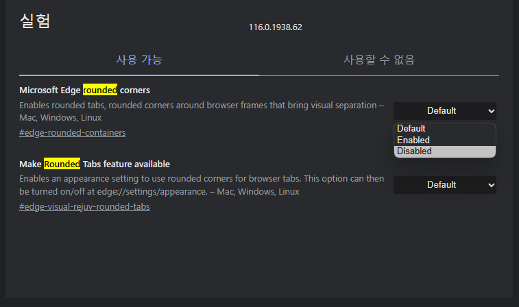 엣지 브라우저 둥근 모서리 끄기 2023.08.28 07:58 PC.Div.Soft/Windows.Office 반응형 나쁘지 않다고 생각하는데, 창 최대화를 하면 테두리가 사각형으로 하나 생기고, 거기 안에서 둥근 모서리가 적용된다. 굳이 사용할 이유가 없지 않나 싶어서 설정 살펴보는데도 안보여서 구글링해봄. 실험 기능이라 일부에겐 켜고 일부에게 끄고 그런지 모르겠는데, 기본값은 켜져 있다. 이걸 disabled로 바꾸면 끝. edge://flags를 주소창에 입력해서 플래그를 열고, 검색창에 rounded corners라고 검색하고(rounded라고만 입력해도 뜸), 드롭 다운 버튼 눌러서 Disabled로 선택한 뒤, 브라우저 재시작하면 적용되니 참조합시다. 반응형 공유하기 게시글 관리 Klein Berry 'PC.Div.Soft > Windows.Office' 카테고리의 다른 글 MS, Intel CPU Downfall 취약점 완화 비활성화 방법 공개 (0) 2023.08.30 윈도11에서 미묘하게 일부 기능이 버벅일 때 (0) 2023.08.24 윈도 업데이트 후 연도나 날짜가 비정상일때 (0) 2023.08.24 댓글 공유하기 다른 글 댓글 이 글 공유하기 구독하기 구독하기 카카오톡 카카오톡 라인 라인 트위터 트위터 Facebook Facebook 카카오스토리 카카오스토리 밴드 밴드 네이버 블로그 네이버 블로그 Pocket Pocket Evernote Evernote 다른 글 Microsoft, Windows 11에서 워드패드 기본 제공 중단 Microsoft, Windows 11에서 워드패드 기본 제공 중단 2023.09.04 MS, Intel CPU Downfall 취약점 완화 비활성화 방법 공개 MS, Intel CPU Downfall 취약점 완화 비활성화 방법 공개 2023.08.30 윈도11에서 미묘하게 일부 기능이 버벅일 때 윈도11에서 미묘하게 일부 기능이 버벅일 때 2023.08.24 윈도 업데이트 후 연도나 날짜가 비정상일때 윈도 업데이트 후 연도나 날짜가 비정상일때 2023.08.24 다른 글 더 둘러보기