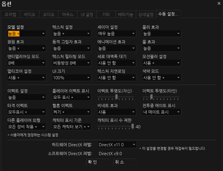 지금까지 쓰면서 해본 설정 중에 그럭저럭 프레임 제한 해제....를 켜 볼만한 설정은 게임 내 옵션은 DX9로 두고(안티는 2배만 걸고), AMD 소프트웨어에서 안티 및 비방관련한 옵션을 설정하면 좀 더 할만하다. 근데 DX9는 게임 내 이펙트가 되게 흐려져서 좀 꺼려지게 되서 DX11로 쓰고 싶어 방편을 찾아보는 중.