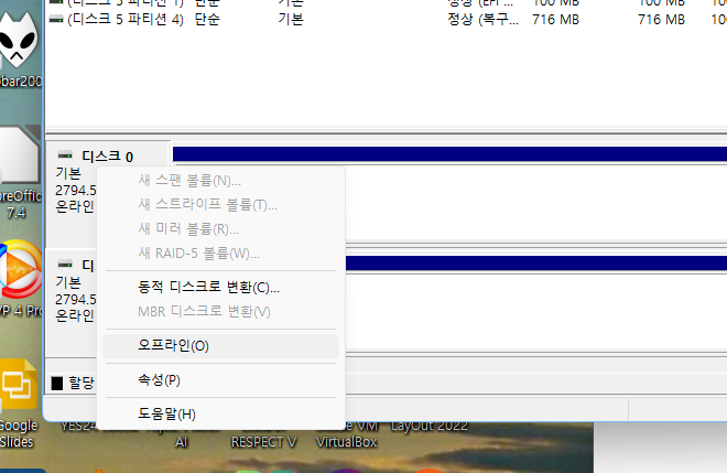 diskpart에서 한다면 list disk 등으로 디스크 목록 확인하고, sel disk 2 등으로 오프라인/온라인으로 만들 디스크를 선택한 뒤, online disk, offline disk 를 입력하여 온라인/오프라인 상태를 바꿔줄 수 있으니 참조합시다.
