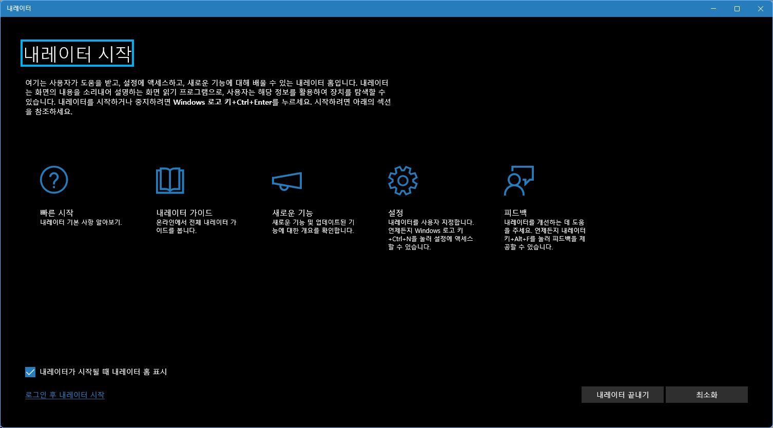 윈도11, 내래이터 켜고 끄기 2023.10.03 11:54 PC.Div.Soft/Windows.Office 반응형 오늘 갑자기 메뉴랑 글을 읽어주는데 이거 어떻게 끄냐고 물어보는 사람이 있어서 포스팅. 시작 > 검색에서 내래이터라고 적으면 내래이터 앱이 실행되고, 적혀있는대로 Windows 로고 + Ctrl + Enter로 켜고 끌 수 있다. 설정 > 접근성 > 내래이터에서 관련 설정 변경 가능. 윈도 버전에 따라서 접근성 관련 단축키 등이 다를 수 있으니까 설정과 제어판 등에서 확인해 봅시다. 반응형 공유하기 게시글 관리 Klein Berry 'PC.Div.Soft > Windows.Office' 카테고리의 다른 글 Windows Copilot에게 그려 달라고 한 오리캐 (0) 2023.10.03 윈도11, 9월 업데이트 배포 (0) 2023.09.30 윈도 7/8 키로 10/11 활성화 불가능 (0) 2023.09.29 댓글 공유하기 다른 글 댓글 이 글 공유하기 구독하기 구독하기 카카오톡 카카오톡 라인 라인 트위터 트위터 Facebook Facebook 카카오스토리 카카오스토리 밴드 밴드 네이버 블로그 네이버 블로그 Pocket Pocket Evernote Evernote 다른 글 Windows Copilot, AMD 그래픽 드라이버 세팅값 초기화 이슈 Windows Copilot, AMD 그래픽 드라이버 세팅값 초기화 이슈 2023.10.05 Windows Copilot에게 그려 달라고 한 오리캐 Windows Copilot에게 그려 달라고 한 오리캐 2023.10.03 윈도11, 9월 업데이트 배포 윈도11, 9월 업데이트 배포 2023.09.30 윈도 7/8 키로 10/11 활성화 불가능 윈도 7/8 키로 10/11 활성화 불가능 2023.09.29 다른 글 더 둘러보기