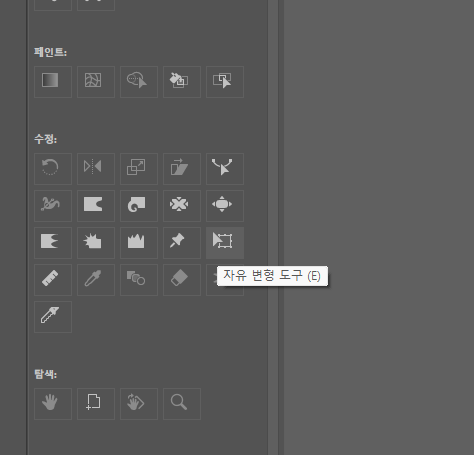 일러스트레이터 도구모음의 기본에는 잘 안보이고, 더보기(...) 버튼 눌러서 수정: 부분에서 자유 변형 도구 (E)를 누르면 사용할 수 있다. 단축키 역시 E. 포토샵과 동일하게 자유 변형툴 선택 후, Ctrl,Alt 키 등을 사용해서 조절이 가능하다.