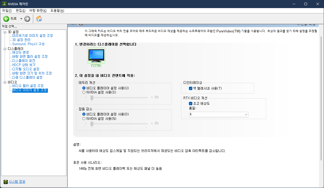 MPC-VR 최신 버전, Geforce 드라이버 최신 버전 설치 후(VSR 지원 그래픽 카드 필요), 우선 NVIDIA 제어판 > 비디오 > 비디오 이미지 설정 조정에서 초고 해상도를 체크해서 활성화하자(품질은 3~4정도 권장). 참고로 MPC-VR 설치는 압축풀고, 적당한 곳에 파일 옮겨두고, 각 설치 배치 파일 관리자 권한으로 실행해주면 된다.