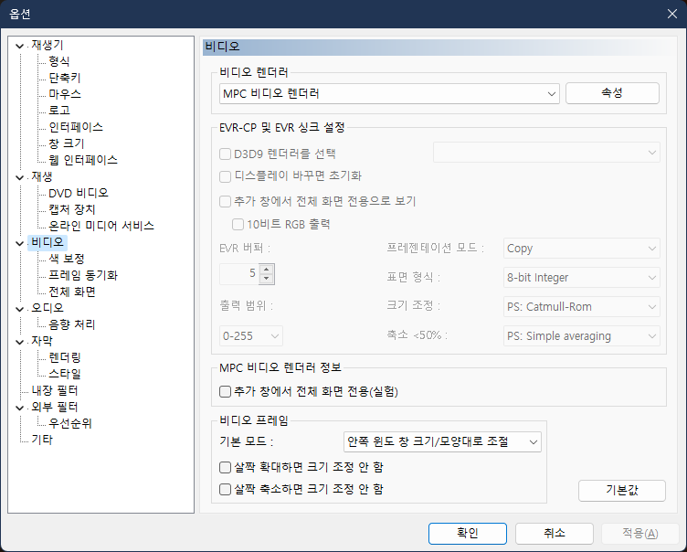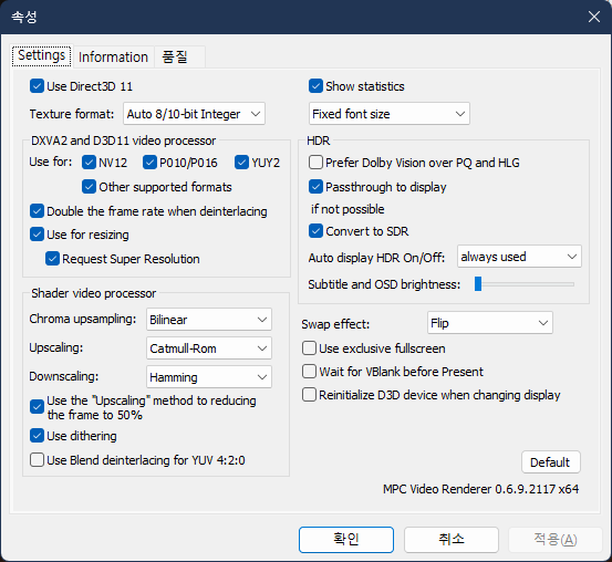 그 후 MPC-BE에서 MPC Video Renderer를 사용하도록 설정하고(메뉴바의 보기 - 옵션에서 비디오/오디오 모두 MPC 렌더러로 설정), 속성을 누른 뒤 나오는 MPC Video Render 속성에서 Use for resizing 아래에 있는 Request Super Resolution을 체크한 뒤, 비디오를 재시작해주면 된다.