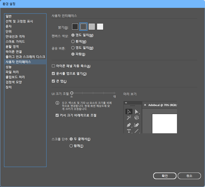 어도비 일러스트레이터) 캔버스 색상 변경하기 2023.11.20 22:01 Web.World/Tip.Cad.De.3D.Font 반응형 [편집] > 환경 설정 > 사용자 인터페이스부분에서 캔버스 색상을 바꿀 수 있다. 흰색을 사용하는 경우 있더라. 대지 숨기기/보기(Ctrl+Shift+H)를 변경해도 되고. 내 경우엔 그냥 검게 해서 사용하는 편. 배경 흰색인거 좋아하는 사람도 있으니까 메뉴 밝기와 캔버스 색상 모두 바꿀 수 있다는 거 알아두도록 합시다. 반응형 공유하기 게시글 관리 Klein Berry 'Web.World > Tip.Cad.De.3D.Font' 카테고리의 다른 글 한글)그림이 표 안에서만 움직일 때 (0) 2023.11.21 마루 부리 글꼴, 클로바 나눔 손글씨 등 다운로드 (0) 2023.11.19 신동엽 시인 손글씨 서체 (0) 2023.11.19 댓글 공유하기 다른 글 댓글 이 글 공유하기 구독하기 구독하기 카카오톡 카카오톡 라인 라인 트위터 트위터 Facebook Facebook 카카오스토리 카카오스토리 밴드 밴드 네이버 블로그 네이버 블로그 Pocket Pocket Evernote Evernote 다른 글 일러스트레이터)UI 크기 변경하기 일러스트레이터)UI 크기 변경하기 2023.11.21 한글)그림이 표 안에서만 움직일 때 한글)그림이 표 안에서만 움직일 때 2023.11.21 마루 부리 글꼴, 클로바 나눔 손글씨 등 다운로드 마루 부리 글꼴, 클로바 나눔 손글씨 등 다운로드 2023.11.19 신동엽 시인 손글씨 서체 신동엽 시인 손글씨 서체 2023.11.19 다른 글 더 둘러보기