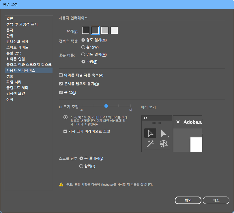 일러스트레이터)UI 크기 변경하기 2023.11.21 21:41 Web.World/Tip.Cad.De.3D.Font 반응형 일러스트레이터 앱의 경우 윈도의 해상도 확대의 영향을 받지 않는 숫자 입력등....이 있다. 이 경우 일러스트레이터의 환경 설정 > 사용자 인터페이스에서 UI 크기 조절을 사용하면 UI가 전체적으로 커지는 효과가 있으니 필요하면 사용하도록 합시다. 반응형 공유하기 게시글 관리 Klein Berry 'Web.World > Tip.Cad.De.3D.Font' 카테고리의 다른 글 구글 시트, SUMIF 함수 활용하기 (0) 2023.11.21 한글)그림이 표 안에서만 움직일 때 (0) 2023.11.21 어도비 일러스트레이터) 캔버스 색상 변경하기 (0) 2023.11.20 댓글 공유하기 다른 글 댓글 이 글 공유하기 구독하기 구독하기 카카오톡 카카오톡 라인 라인 트위터 트위터 Facebook Facebook 카카오스토리 카카오스토리 밴드 밴드 네이버 블로그 네이버 블로그 Pocket Pocket Evernote Evernote 다른 글 구글 문서/시트에서 한글 폰트 변경하기 구글 문서/시트에서 한글 폰트 변경하기 2023.11.21 구글 시트, SUMIF 함수 활용하기 구글 시트, SUMIF 함수 활용하기 2023.11.21 한글)그림이 표 안에서만 움직일 때 한글)그림이 표 안에서만 움직일 때 2023.11.21 어도비 일러스트레이터) 캔버스 색상 변경하기 어도비 일러스트레이터) 캔버스 색상 변경하기 2023.11.20 다른 글 더 둘러보기
