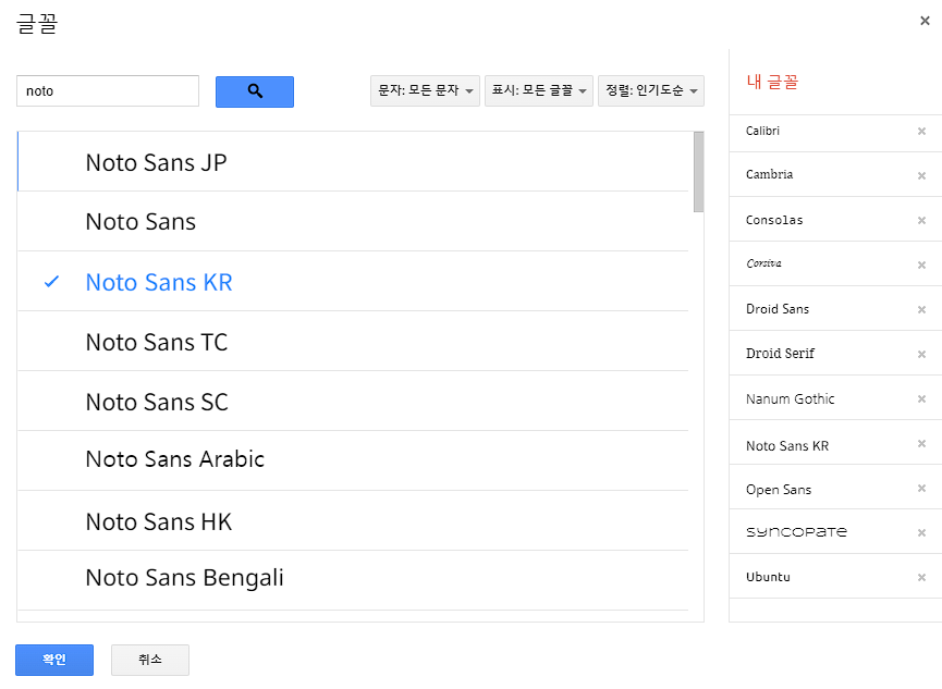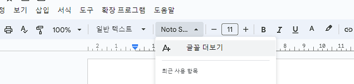 글꼴이 처음에는 별로 등록이 안되어 있는데 여기서 글꼴 더보기 버튼 누르면 구글 폰트에 등록되어 있는 폰트를 사용할 수 있다.