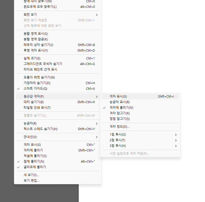 일러스트레이터 원근감 격자 지우기 2023.11.24 23:04 Web.World/Tip.Cad.De.3D.Font 반응형 Ctrl+Shift+O(윤곽선 만들기)하다가 종종 키를 잘못 눌러서 이거 띄우고는 하는 것 같다. 갑자기 화면에 3D 처럼 보이는 격자가 나오는데 이게 잘 사라지지 않는 경우라면 [보기] 메뉴에서 원금각 격자를 켜고 끌 수 있으니 참고하고, 단축키는 Shift+Ctrl+I니까 참조합시다. 반응형 공유하기 게시글 관리 Klein Berry 'Web.World > Tip.Cad.De.3D.Font' 카테고리의 다른 글 일러스트레이터)내보내기 시 흰색 오브젝트, 글자 안보일 적에 (0) 2023.11.28 구글 문서/시트에서 한글 폰트 변경하기 (0) 2023.11.21 구글 시트, SUMIF 함수 활용하기 (0) 2023.11.21 댓글 공유하기 다른 글 댓글 이 글 공유하기 구독하기 구독하기 카카오톡 카카오톡 라인 라인 트위터 트위터 Facebook Facebook 카카오스토리 카카오스토리 밴드 밴드 네이버 블로그 네이버 블로그 Pocket Pocket Evernote Evernote 다른 글 어도비 일러스트레이터)화살표 좀 더 쉽게 만들기 어도비 일러스트레이터)화살표 좀 더 쉽게 만들기 2023.11.29 일러스트레이터)내보내기 시 흰색 오브젝트, 글자 안보일 적에 일러스트레이터)내보내기 시 흰색 오브젝트, 글자 안보일 적에 2023.11.28 구글 문서/시트에서 한글 폰트 변경하기 구글 문서/시트에서 한글 폰트 변경하기 2023.11.21 구글 시트, SUMIF 함수 활용하기 구글 시트, SUMIF 함수 활용하기 2023.11.21 다른 글 더 둘러보기