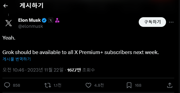 일론 머스크, 대화형 AI Grok 이번 주 공개 예정 2023.11.28 21:41 Web.World/Ai.ML.SD 반응형 AI 개발 기업 xAI에서 개발 중인 대화형 AI 'Grok'의 공개와 관련해 일론 머스크가 트윗을 올렸다고 합니다. 다음주(11월 22일 기준)부터 X Premium+ 사용자가 사용할 수 있을 것이라고 하네요. 반응형 공유하기 게시글 관리 Klein Berry 'Web.World > Ai.ML.SD' 카테고리의 다른 글 아마존, 비지니스용 대화형 AI, Amazon Q 발표 (0) 2023.11.29 음성 기능이 포함된 ChatGPT, 무료 유저도 사용 가능 (0) 2023.11.27 Stability AI, 영상을 생성하는 AI 모델 Stable Video Diffusion (0) 2023.11.25 댓글 공유하기 다른 글 댓글 이 글 공유하기 구독하기 구독하기 카카오톡 카카오톡 라인 라인 트위터 트위터 Facebook Facebook 카카오스토리 카카오스토리 밴드 밴드 네이버 블로그 네이버 블로그 Pocket Pocket Evernote Evernote 다른 글 텍스트에서 실시간 AI 이미지를 생성하는 SDXL Turbo 텍스트에서 실시간 AI 이미지를 생성하는 SDXL Turbo 2023.11.29 아마존, 비지니스용 대화형 AI, Amazon Q 발표 아마존, 비지니스용 대화형 AI, Amazon Q 발표 2023.11.29 음성 기능이 포함된 ChatGPT, 무료 유저도 사용 가능 음성 기능이 포함된 ChatGPT, 무료 유저도 사용 가능 2023.11.27 Stability AI, 영상을 생성하는 AI 모델 Stable Video Diffusion Stability AI, 영상을 생성하는 AI 모델 Stable Video Diffusion 2023.11.25 다른 글 더 둘러보기
