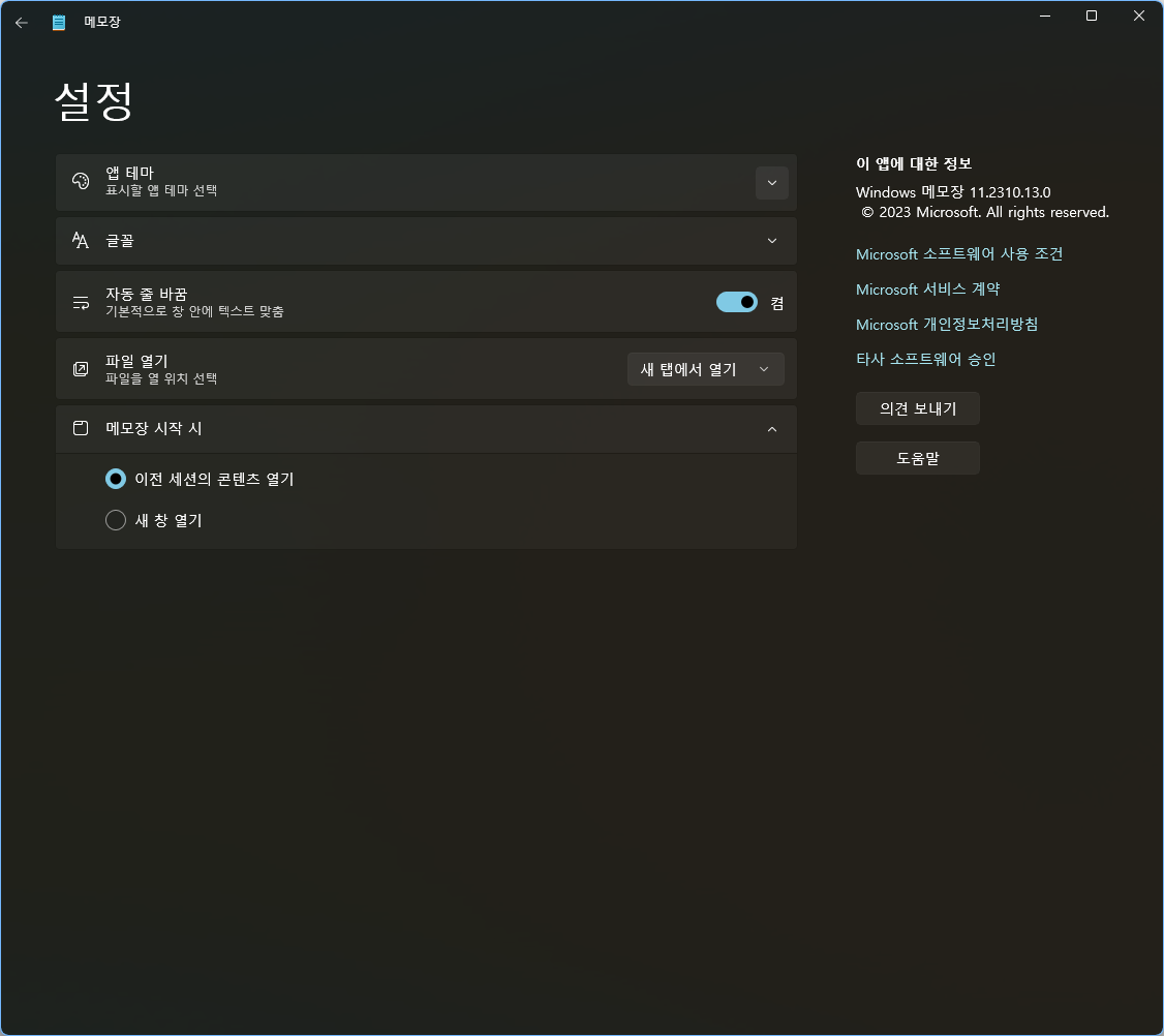 윈도11 프리뷰 버전에서 메모장 개선(글자 수 표시 지원) 2023.12.09 01:55 PC.Div.Soft/Windows.Office 반응형 윈도 11 인사이더 프리뷰 Canary 채널의 26010 빌드에서 새로운 위젯 보드 설정 기능, 코파일럿 UI 개선 등이 이루어졌다고 하며, 메모장으로 편집하는 메뉴가 파일 탐색기에 추가되고, 메모장 앱에 문자 수를 표시하는 기능이 추가된다고 합니다. 참 메모장 실행 시 이전 내용이 보이지 않게 설정하려면 메모장 앱 실행 후 왼쪽 상단의 설정(톱니바퀴)를 눌러서 메모장 시작 시 부분에서 새 창 열기로 바꿔주면 됩니다. 반응형 공유하기 게시글 관리 Klein Berry 'PC.Div.Soft > Windows.Office' 카테고리의 다른 글 Windows 11 23H2에서 게임 성능 하락 등의 문제 발생 (0) 2023.12.09 Windows xp에서 SSD 사용시, 수동 TRIM하기(우분투 사용) (0) 2023.11.22 Microsoft Loop, 상용 사용 가능 (0) 2023.11.17 댓글 공유하기 다른 글 댓글 이 글 공유하기 구독하기 구독하기 카카오톡 카카오톡 라인 라인 트위터 트위터 Facebook Facebook 카카오스토리 카카오스토리 밴드 밴드 네이버 블로그 네이버 블로그 Pocket Pocket Evernote Evernote 다른 글 윈도10/11의 미라캐스트 지원 사양 윈도10/11의 미라캐스트 지원 사양 2023.12.18 Windows 11 23H2에서 게임 성능 하락 등의 문제 발생 Windows 11 23H2에서 게임 성능 하락 등의 문제 발생 2023.12.09 Windows xp에서 SSD 사용시, 수동 TRIM하기(우분투 사용) Windows xp에서 SSD 사용시, 수동 TRIM하기(우분투 사용) 2023.11.22 Microsoft Loop, 상용 사용 가능 Microsoft Loop, 상용 사용 가능 2023.11.17 다른 글 더 둘러보기