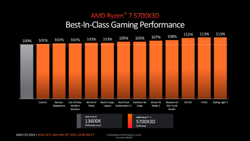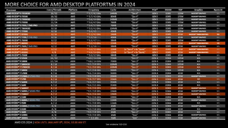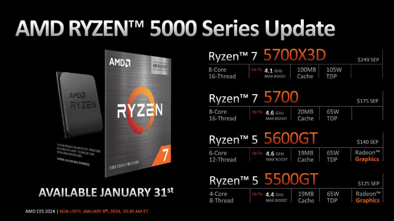 AMD, Ryzen 5700X3D 등 출시 2024.01.09 22:26 PC.Div.Soft/News 반응형 AMD가 1월 31일부터 AM4 소켓 플랫폼 제품군인 Ryzen 5000 제품군의 4개 모델을 추가한다고 합니다. Ryzen 7 5700X3D(8C16T, 4.1GHz, $249, 3D V-Cache 100MB), Ryzen 7 5700($175), Ryzen 5 5600GT($140), Ryzen 5 5500GT($125)이며 GT모델엔 Radeon Graphics 가 포함되어 있습니다. 반응형 공유하기 게시글 관리 Klein Berry 'PC.Div.Soft > News' 카테고리의 다른 글 Intel, 일부 12/13세대 CPU에도 APO 지원 예정 (0) 2024.01.09 AMD, Ryzen 8000G 시리즈 발표 (0) 2024.01.09 좀 더 긴 케이블을 지원하는 DisplayPort 2.1a 사양 발표 (0) 2024.01.09 댓글 공유하기 다른 글 댓글 이 글 공유하기 구독하기 구독하기 카카오톡 카카오톡 라인 라인 트위터 트위터 Facebook Facebook 카카오스토리 카카오스토리 밴드 밴드 네이버 블로그 네이버 블로그 Pocket Pocket Evernote Evernote 다른 글 AMD, VRAM 두 배로 늘린 Radeon RX 7600XT 발표 AMD, VRAM 두 배로 늘린 Radeon RX 7600XT 발표 2024.01.09 Intel, 일부 12/13세대 CPU에도 APO 지원 예정 Intel, 일부 12/13세대 CPU에도 APO 지원 예정 2024.01.09 AMD, Ryzen 8000G 시리즈 발표 AMD, Ryzen 8000G 시리즈 발표 2024.01.09 좀 더 긴 케이블을 지원하는 DisplayPort 2.1a 사양 발표 좀 더 긴 케이블을 지원하는 DisplayPort 2.1a 사양 발표 2024.01.09 다른 글 더 둘러보기