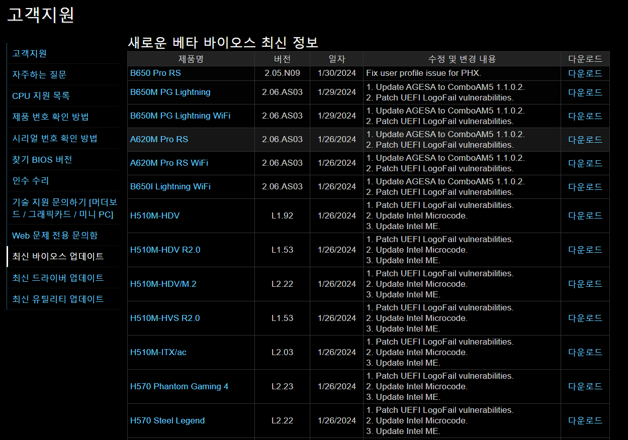 ASRock, 자사 AM5 소켓 머더보드에 AGESA 1.2.0.2 기반 BIOS 배포 2024.01.31 01:04 PC.Div.Soft/Driver.Firmware 반응형 ASRock이 AMD 8000G 시리즈에 맞춰 자사 AMD 600 시리즈 칩셋을 사용하는 AM5 머도보드에 AEGSA 1.2.0.2 기반의 베 타 BIOS를 등록했습니다. AMD 8000 시리즈 APU를 사용 예정인 분들이라면 미리 업데이트를 진행해 두시는 게 좋지 않나 싶네요. 반응형 공유하기 게시글 관리 Klein Berry 'PC.Div.Soft > Driver.Firmware' 카테고리의 다른 글 Realtek PCIe FE / GBE / 2.5G / 5G 이더넷 드라이버 업데이트 (0) 2024.02.24 AMD 소프트웨어: 아드레날린 에디션 24.1.1 출시 (0) 2024.01.24 HP 255 G9 노트북 BIOS 업데이트 (0) 2024.01.23 댓글 공유하기 다른 글 댓글 이 글 공유하기 구독하기 구독하기 카카오톡 카카오톡 라인 라인 트위터 트위터 Facebook Facebook 카카오스토리 카카오스토리 밴드 밴드 네이버 블로그 네이버 블로그 Pocket Pocket Evernote Evernote 다른 글 ASRock, 자사 AM4 기반 머더보드에 Combo V2 Pi 1.2.0.C 기반 BIOS 업데이트 ASRock, 자사 AM4 기반 머더보드에 Combo V2 Pi 1.2.0.C 기반 BIOS 업데이트 2024.02.26 Realtek PCIe FE / GBE / 2.5G / 5G 이더넷 드라이버 업데이트 Realtek PCIe FE / GBE / 2.5G / 5G 이더넷 드라이버 업데이트 2024.02.24 AMD 소프트웨어: 아드레날린 에디션 24.1.1 출시 AMD 소프트웨어: 아드레날린 에디션 24.1.1 출시 2024.01.24 HP 255 G9 노트북 BIOS 업데이트 HP 255 G9 노트북 BIOS 업데이트 2024.01.23 다른 글 더 둘러보기