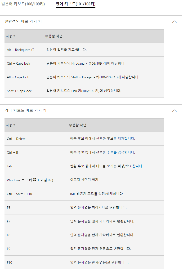 윈도10에 오면서 한국어 IME도 그렇지만 일본어 IME고 버전업하면서 기존의 단축키들(Ctrl+Caps+Tab 등)이 안 먹고, Ctrl+`, Alt+` 같은 일부 단축키만 먹게 되었다. 차선책으론 Google 일본어 입력기 나, ATOK 입력기(유료), 일본어 버전 키보드(JIS 키보드)를 하나 구매하는 게 편하다.