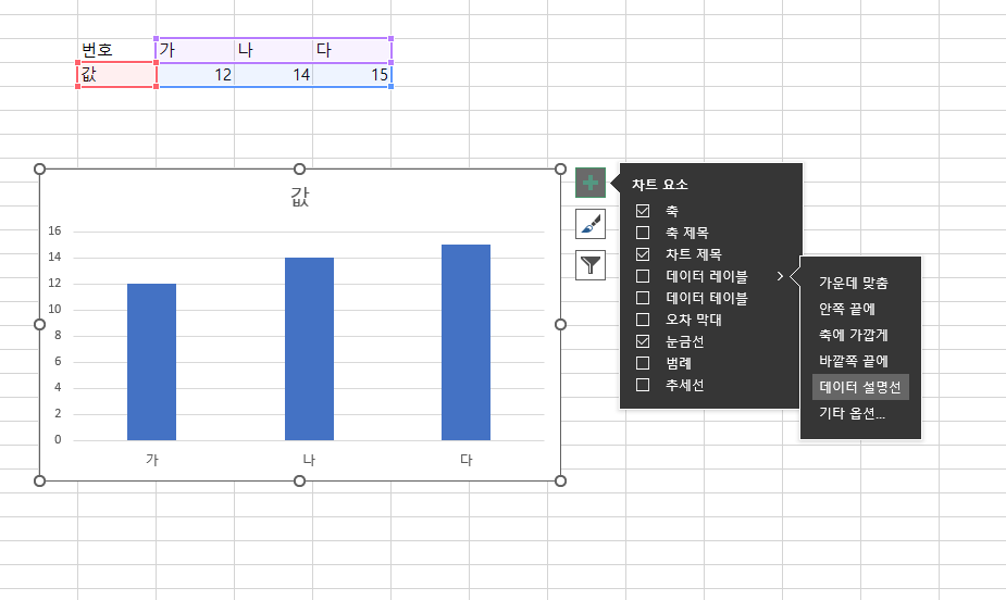 엑셀) 차트 막대에서 데이터 값 표시하기 2024.02.06 21:26 PC.Div.Soft/Windows.Office 반응형 차트 추가한 뒤, 차트 요소 추가 > 차트 요소 > 데이터 레이블을 선택해주면 된다. 차트 요소 추가는 리본 메뉴에서도 가능하지만 차트 선택하면 나오는 초록색 + 버튼 눌러서도 쉽게 할 수 있으니 참조합시다. 반응형 공유하기 게시글 관리 Klein Berry 'PC.Div.Soft > Windows.Office' 카테고리의 다른 글 윈도11, 텍스트 입력 테마 적용하기 (0) 2024.02.14 Windows 일본어 입력기용 단축키(Ctrl+T) (0) 2024.02.04 윈도11 23H2 의 알려진 문제 (0) 2023.12.22 댓글 공유하기 다른 글 댓글 이 글 공유하기 구독하기 구독하기 카카오톡 카카오톡 라인 라인 트위터 트위터 Facebook Facebook 카카오스토리 카카오스토리 밴드 밴드 네이버 블로그 네이버 블로그 Pocket Pocket Evernote Evernote 다른 글 엑셀) 개발 도구 메뉴 표시하기 엑셀) 개발 도구 메뉴 표시하기 2024.02.20 윈도11, 텍스트 입력 테마 적용하기 윈도11, 텍스트 입력 테마 적용하기 2024.02.14 Windows 일본어 입력기용 단축키(Ctrl+T) Windows 일본어 입력기용 단축키(Ctrl+T) 2024.02.04 윈도11 23H2 의 알려진 문제 윈도11 23H2 의 알려진 문제 2023.12.22 다른 글 더 둘러보기