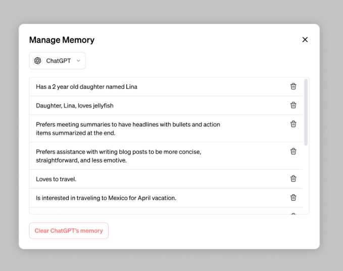 ChatGPT, 과거 내역을 기억하는 메모리 기능 추가 2024.02.14 21:52 Web.World/Ai.ML.SD 반응형 OpenAI에서 ChatGPT에 기억(Memory)를 추가하여 관련 기능을 제공한다고 합니다. ChatGPT가 사용자와 교환한 내용을 기억하고, 이를 사용하여 좀 더 나은 답변을 제공할 수 있게 하느 기능이라고 하네요. 이러한 메모리 기능을 제공하는 AI 서비스로는 KIN이 있으니 활용해보세요. 반응형 공유하기 게시글 관리 Klein Berry 'Web.World > Ai.ML.SD' 카테고리의 다른 글 NVIDIA, ChatRTX 개선 (0) 2024.05.06 NVIDIA, PC에서 실행되는 맞춤형 AI, Chat with RTX 무료 출시 (0) 2024.02.14 Audacity용 OpenVINO AI 효과 추가 (0) 2024.02.14 댓글 공유하기 다른 글 댓글 이 글 공유하기 구독하기 구독하기 카카오톡 카카오톡 라인 라인 트위터 트위터 Facebook Facebook 카카오스토리 카카오스토리 밴드 밴드 네이버 블로그 네이버 블로그 Pocket Pocket Evernote Evernote 다른 글 ChatGPT, 임시 채팅 모드 추가 ChatGPT, 임시 채팅 모드 추가 2024.05.06 NVIDIA, ChatRTX 개선 NVIDIA, ChatRTX 개선 2024.05.06 NVIDIA, PC에서 실행되는 맞춤형 AI, Chat with RTX 무료 출시 NVIDIA, PC에서 실행되는 맞춤형 AI, Chat with RTX 무료 출시 2024.02.14 Audacity용 OpenVINO AI 효과 추가 Audacity용 OpenVINO AI 효과 추가 2024.02.14 다른 글 더 둘러보기