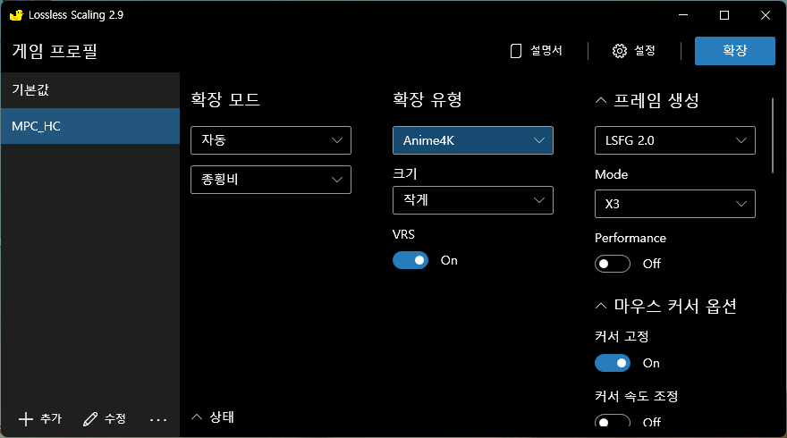 MPC-BE(MPV 사용)으로 가능하더라. Lossless Scaling을 사용하면 프레임 생성, 업스케일링 기능을 여러 게임에 적용할 수 있게 해주는데 MPC-BE도 가능. 사용하는 방법은 간단하다. 프로필 하나 생성해서 만들고, 확장 모드는 자동, 종횡비, 확장 유형은 마음에 드는 걸로(LS1, Anime4K, AMD FSR 등 다 무난하더라), 프레임 뻥튀기를 원한면 LSGF 2.0, Mode는 X2나 X3이나 요즘PC에서는 큰 무리가 없지 않나 싶음.