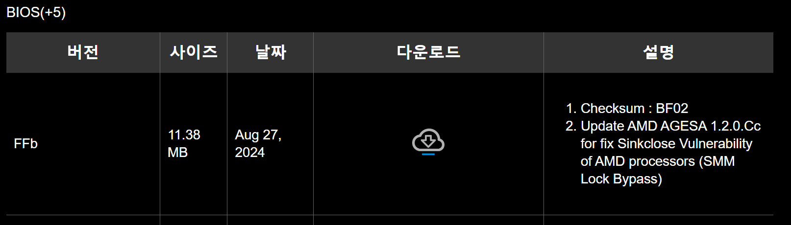 ASRock/GIGABYTE AM4 머더보드 BIOS 업데이트 2024.08.31 23:03 PC.Div.Soft/Free Software 반응형 ASRock과 GIGABYTE 머더보드에 AMD의 취약점을 해결하는 AGEAS Combo V2 PI 1.2.0.Cc를 기반으로 하는 신규 BIOS가 등록되기 시작했습니다. 사용하는 CPU에 주의하면서, 보드 업데이트를 챙겨보세요. 반응형 공유하기 게시글 관리 Klein Berry 'PC.Div.Soft > Free Software' 카테고리의 다른 글 Synfig - 오픈소스 2D 애니메이션 앱 (0) 2024.10.07 3DF Zephyr 무료 버전 (0) 2024.08.17 SkyeBrowse - 동영상을 2D MAP으로 변경 (0) 2024.08.11 댓글 공유하기 다른 글 댓글 이 글 공유하기 구독하기 구독하기 카카오톡 카카오톡 라인 라인 트위터 트위터 Facebook Facebook 카카오스토리 카카오스토리 밴드 밴드 네이버 블로그 네이버 블로그 Pocket Pocket Evernote Evernote 다른 글 Avee Player - 무료 음악 시각화 재생기 Avee Player - 무료 음악 시각화 재생기 2024.10.14 Synfig - 오픈소스 2D 애니메이션 앱 Synfig - 오픈소스 2D 애니메이션 앱 2024.10.07 3DF Zephyr 무료 버전 3DF Zephyr 무료 버전 2024.08.17 SkyeBrowse - 동영상을 2D MAP으로 변경 SkyeBrowse - 동영상을 2D MAP으로 변경 2024.08.11 다른 글 더 둘러보기