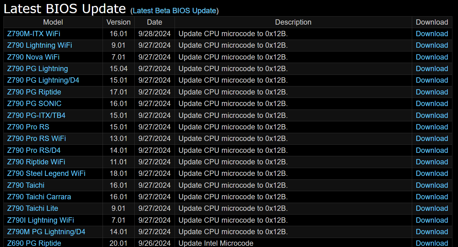 ASRock, 인텔 0x12B 마이크로 코드 기반의 BIOS 업데이트 출시 2024.09.28 18:57 PC.Div.Soft 반응형 ASRock이 자사의 일부 머더보드에 인텔의 신규 0x12B 마이크로 코드 기반의 BIOS 업데이트를 진행하였습니다. 일단은 Z790 머더보드부터 시작이네요. 사용하시는 분들은 업데이트를 챙겨보세요. 반응형 공유하기 게시글 관리 Klein Berry 'PC.Div.Soft' 카테고리의 다른 글 최신 시스템에 Windows XP 구동하기 (0) 2024.09.29 롬라이터 CH341A를 사용한 BIOS 플래싱 (0) 2024.09.24 PixArt PAW3950 센서 채용 마우스 (0) 2024.09.23 댓글 공유하기 다른 글 댓글 이 글 공유하기 구독하기 구독하기 카카오톡 카카오톡 라인 라인 트위터 트위터 Facebook Facebook 카카오스토리 카카오스토리 밴드 밴드 네이버 블로그 네이버 블로그 Pocket Pocket Evernote Evernote 다른 글 EFM ipTIME BE3600QCA EFM ipTIME BE3600QCA 2024.12.29 최신 시스템에 Windows XP 구동하기 최신 시스템에 Windows XP 구동하기 2024.09.29 롬라이터 CH341A를 사용한 BIOS 플래싱 롬라이터 CH341A를 사용한 BIOS 플래싱 2024.09.24 PixArt PAW3950 센서 채용 마우스 PixArt PAW3950 센서 채용 마우스 2024.09.23 다른 글 더 둘러보기