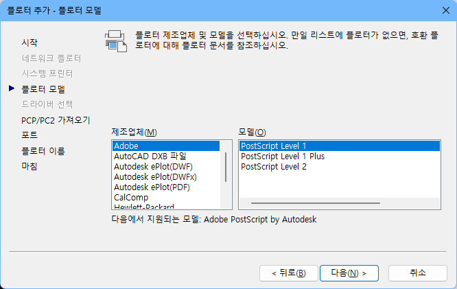 비교적 최신 오토캐드라면 출력 > 플로터 관리자를 누르면 캐드가 설치된 폴더 내의 Plotters 폴더가 열리고, 플로터 추가 마법사 바로가기를 실행하면 된다. 플로터 추가 마법사에서 내 컴퓨터 > Adobe > PostScript Level1/2(1은 포토샵 6버전 이하용)를 선택해서 추가하고, 이후로는 여타 플롯하는 것과 동일하게 진행하면 되니까 참조합시다.
