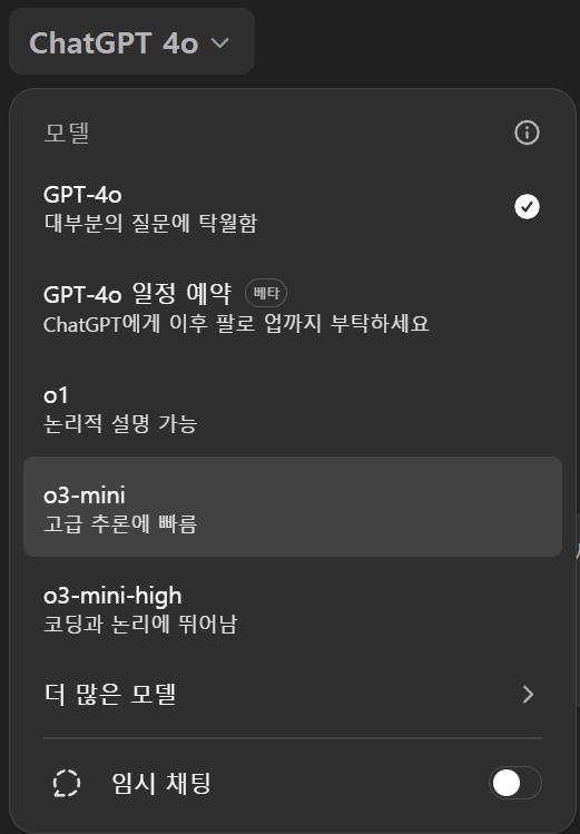 ChatGPT, O3-mini 사용 가능 2025.02.01 19:28 Web.World/Ai.ML.SD 반응형 ChatGPT에서 얼마전 발표된 o3-mini 모델이 공개되었습니다. 비용 효율적인 추론 모델이며, 과학, 수학과 같은 분야에서 뛰어난 성능을 보인다고 하며 무료 사용자도 메시지 작성창에서 Reason 선택을 사용해 o3-mini 사용이 가능하다고 합니다. 요즘 AI 경쟁이 더 치열해지네요.... 반응형 공유하기 게시글 관리 Klein Berry 'Web.World > Ai.ML.SD' 카테고리의 다른 글 포니 디퓨전(Pony Diffusion), ILXL (0) 2025.02.02 Fooocus에서의 와일드 카드 사용 (0) 2025.02.01 네거티브 프롬프트에 hands 추가하여 SD의 5개 이상 손가락 생성 방지 (0) 2025.02.01 댓글 공유하기 다른 글 댓글 이 글 공유하기 구독하기 구독하기 카카오톡 카카오톡 라인 라인 트위터 트위터 Facebook Facebook 카카오스토리 카카오스토리 밴드 밴드 네이버 블로그 네이버 블로그 Pocket Pocket Evernote Evernote 다른 글 Zonos - 고품질 음성 합성 모델 Zonos - 고품질 음성 합성 모델 2025.02.14 포니 디퓨전(Pony Diffusion), ILXL 포니 디퓨전(Pony Diffusion), ILXL 2025.02.02 Fooocus에서의 와일드 카드 사용 Fooocus에서의 와일드 카드 사용 2025.02.01 네거티브 프롬프트에 hands 추가하여 SD의 5개 이상 손가락 생성 방지 네거티브 프롬프트에 hands 추가하여 SD의 5개 이상 손가락 생성 방지 2025.02.01 다른 글 더 둘러보기