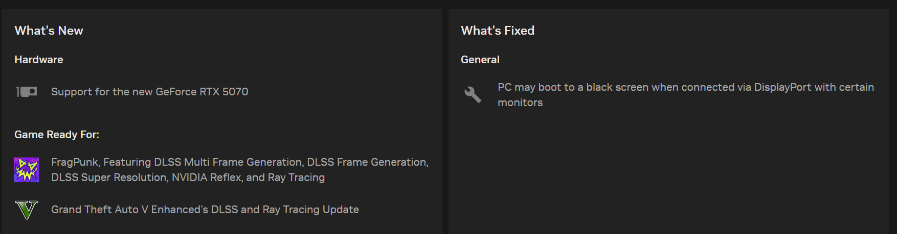 NVIDIA, Geforce Game Ready 드라이버 572.70 출시 2025.03.06 19:10 PC.Div.Soft/Driver.Firmware 반응형 요즘 어지간하면 드라이버 업데이트 관련해서 특별한 기능 제공같은 거 없으면 크게 신경 안쓰는 편인데; 이번에는 드라이버 수정 내역에 생각보다 엄청난게 있어서 가져왔습니다. RTX 5070 지원 외에 DP로 연결하면 일부 모니터에서 블랙 스크린 뜨는(....) 문제가 해결되었다고 하니 사용하시는 분들은 업데이트를 챙겨보세요. 반응형 공유하기 게시글 관리 Klein Berry 'PC.Div.Soft > Driver.Firmware' 카테고리의 다른 글 ifi ZEN AIR DAC 드라이버(5.57)/펌웨어(7.60) 업데이트 (0) 2025.03.08 ASUS Setup Tool(구버전 ASUS 유틸 설치 프로그램) (0) 2025.03.03 Acer Nitro ANV16-71 BIOS 업데이트 (0) 2025.02.28 댓글 공유하기 다른 글 댓글 이 글 공유하기 구독하기 구독하기 카카오톡 카카오톡 라인 라인 트위터 트위터 Facebook Facebook 카카오스토리 카카오스토리 밴드 밴드 네이버 블로그 네이버 블로그 Pocket Pocket Evernote Evernote 다른 글 SMSL XMOS 칩셋 사용 제품군 드라이버 업데이트 SMSL XMOS 칩셋 사용 제품군 드라이버 업데이트 2025.03.08 ifi ZEN AIR DAC 드라이버(5.57)/펌웨어(7.60) 업데이트 ifi ZEN AIR DAC 드라이버(5.57)/펌웨어(7.60) 업데이트 2025.03.08 ASUS Setup Tool(구버전 ASUS 유틸 설치 프로그램) ASUS Setup Tool(구버전 ASUS 유틸 설치 프로그램) 2025.03.03 Acer Nitro ANV16-71 BIOS 업데이트 Acer Nitro ANV16-71 BIOS 업데이트 2025.02.28 다른 글 더 둘러보기