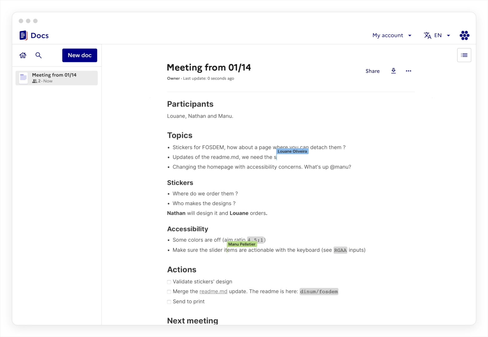 Docs - 오픈소스 노션 대체제 2025.03.18 23:29 PC.Div.Soft/Free Software 반응형 마크다운 없이도 협업 편집이 가능한 오픈소스 텍스트 편집기입니다. 프랑스와 독일 정부가 지원하는 프로젝트라고 하네요. 반응형 공유하기 게시글 관리 Klein Berry 'PC.Div.Soft > Free Software' 카테고리의 다른 글 DXVK 2.6.1 출시 - D3D11 NVIDIA Reflex 지원 외 (0) 2025.03.19 GIMP 3.0 정식 출시 (0) 2025.03.18 DROP WPBT - Windows 플랫폼 이진 테이블 비활성화 (0) 2025.03.13 댓글 공유하기 다른 글 댓글 이 글 공유하기 구독하기 구독하기 카카오톡 카카오톡 라인 라인 트위터 트위터 Facebook Facebook 카카오스토리 카카오스토리 밴드 밴드 네이버 블로그 네이버 블로그 Pocket Pocket Evernote Evernote 다른 글 X-Mouse 버튼 제어 X-Mouse 버튼 제어 2025.03.20 DXVK 2.6.1 출시 - D3D11 NVIDIA Reflex 지원 외 DXVK 2.6.1 출시 - D3D11 NVIDIA Reflex 지원 외 2025.03.19 GIMP 3.0 정식 출시 GIMP 3.0 정식 출시 2025.03.18 DROP WPBT - Windows 플랫폼 이진 테이블 비활성화 DROP WPBT - Windows 플랫폼 이진 테이블 비활성화 2025.03.13 다른 글 더 둘러보기