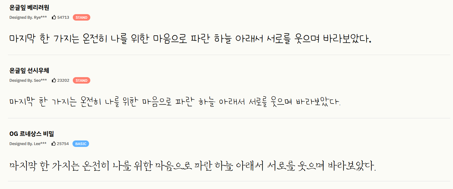 온글잎 무료 폰트 2025.03.20 20:47 Web.World/Tip.Cad.De.3D.Font 반응형 요즘은 그냥 눈누....에서 찾아보는게 더 빨라서 굳이 포스팅해야 하나 싶은데, 그래도 간간히 하나씩 발견해 나가는 재미가 있기도 해서 포스팅. 웹페이지는 여기. 라이센스는 개작 불가, 폰트 유료 판매 불가고, 상업적 사용도 가능하다. 반응형 공유하기 게시글 관리 Klein Berry 'Web.World > Tip.Cad.De.3D.Font' 카테고리의 다른 글 Canva 대신 사용할 수 있는 웹앱 (0) 2025.03.21 Freesentation, paperlogy 폰트 (0) 2025.03.20 Monoplex KR - 프로그래밍 글꼴 (0) 2025.03.20 댓글 공유하기 다른 글 댓글 이 글 공유하기 구독하기 구독하기 카카오톡 카카오톡 라인 라인 트위터 트위터 Facebook Facebook 카카오스토리 카카오스토리 밴드 밴드 네이버 블로그 네이버 블로그 Pocket Pocket Evernote Evernote 다른 글 Color Palette Builder Color Palette Builder 2025.03.23 Canva 대신 사용할 수 있는 웹앱 Canva 대신 사용할 수 있는 웹앱 2025.03.21 Freesentation, paperlogy 폰트 Freesentation, paperlogy 폰트 2025.03.20 Monoplex KR - 프로그래밍 글꼴 Monoplex KR - 프로그래밍 글꼴 2025.03.20 다른 글 더 둘러보기