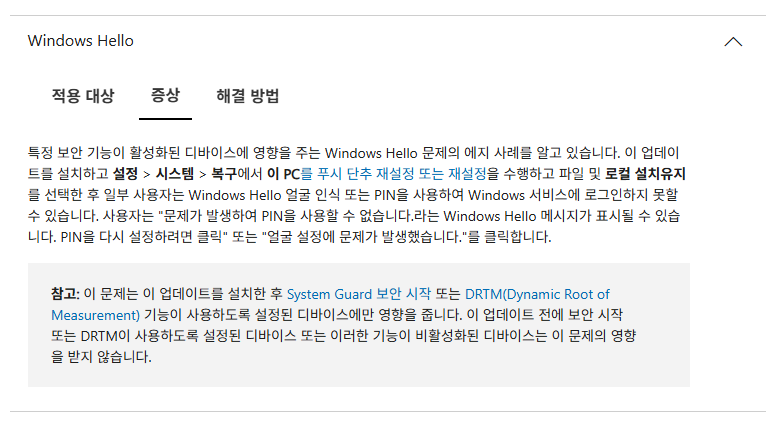 Microsoft, Windows 11 업데이트 후 Hello 얼굴 인식 문제 2025.04.16 19:25 PC.Div.Soft/Windows.Office 반응형 얼마전에 있었던 윈도 11업데이트(KB5055523) 후, Windows Hello에 문제(얼굴 인식 및 PIN)가 발생할 수 있다고 합니다. 또 Outlook을 사용하면 CPU 사용률이 30~50%까지 치솟는 문제도 있다고 하네요. Windows Hello 기능 사용자분들은 참조하세요. 반응형 공유하기 게시글 관리 Klein Berry 'PC.Div.Soft > Windows.Office' 카테고리의 다른 글 윈도에서 모니터 끄기 바로가기 만들기 (0) 2025.04.19 Windows 95 시동음, 가치 있는 유산으로 인정 (0) 2025.04.13 Windows Update 후 생긴 Interpub 폴더 삭제하지 말 것을 권함 (0) 2025.04.12 댓글 공유하기 다른 글 댓글 이 글 공유하기 구독하기 구독하기 카카오톡 카카오톡 라인 라인 트위터 트위터 Facebook Facebook 카카오스토리 카카오스토리 밴드 밴드 네이버 블로그 네이버 블로그 Pocket Pocket Evernote Evernote 다른 글 winget 명령을 사용한 앱 업데이트 및 설치 winget 명령을 사용한 앱 업데이트 및 설치 2025.04.27 윈도에서 모니터 끄기 바로가기 만들기 윈도에서 모니터 끄기 바로가기 만들기 2025.04.19 Windows 95 시동음, 가치 있는 유산으로 인정 Windows 95 시동음, 가치 있는 유산으로 인정 2025.04.13 Windows Update 후 생긴 Interpub 폴더 삭제하지 말 것을 권함 Windows Update 후 생긴 Interpub 폴더 삭제하지 말 것을 권함 2025.04.12 다른 글 더 둘러보기