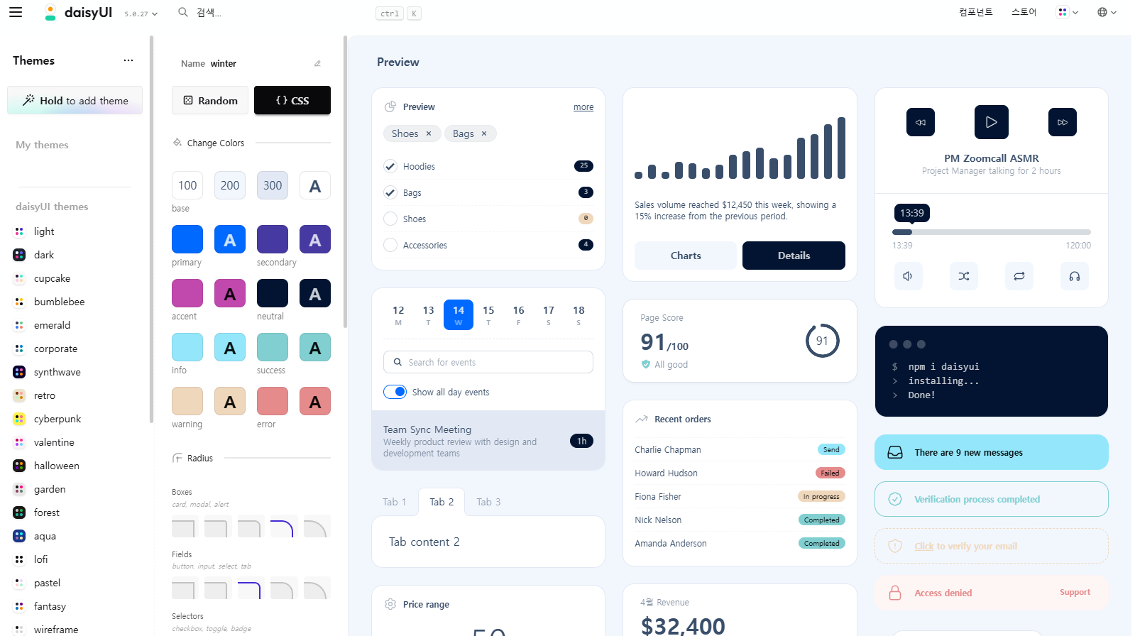 daisyUI - Tailwind CSS 컴포넌트 2025.04.18 22:43 Web.World 반응형 TailwindCSS를 좀 더 쉽게, 자주 쓰는 버튼이나 체크 바그 같은걸 예쁘게 만들 수 있다. 테일윈드랑 동일하게 npm으로 설치 가능하다. Tailwind CSS가 없어도 쓸 수는 있지만 굳이...? 이거 되게 이쁘게 잘 만들어주니까 필요하면 사용하도록 합시다. 컴포넌트 설명은 여기 참조. 테마 생성기도 있더라. 반응형 공유하기 게시글 관리 Klein Berry 'Web.World' 카테고리의 다른 글 티스토리, 애드센스 앵커 광고, 오퍼월 광고 설정 불가 (0) 2025.04.30 마우스 더블 클릭 체커 (0) 2025.04.16 심플 PHP 갤러리 - AI로 만들어보자 (0) 2025.04.16 댓글 공유하기 다른 글 댓글 이 글 공유하기 구독하기 구독하기 카카오톡 카카오톡 라인 라인 트위터 트위터 Facebook Facebook 카카오스토리 카카오스토리 밴드 밴드 네이버 블로그 네이버 블로그 Pocket Pocket Evernote Evernote 다른 글 Google Sheets, Gemini로 자연어 조작 가능 Google Sheets, Gemini로 자연어 조작 가능 2025.05.15 티스토리, 애드센스 앵커 광고, 오퍼월 광고 설정 불가 티스토리, 애드센스 앵커 광고, 오퍼월 광고 설정 불가 2025.04.30 마우스 더블 클릭 체커 마우스 더블 클릭 체커 2025.04.16 심플 PHP 갤러리 - AI로 만들어보자 심플 PHP 갤러리 - AI로 만들어보자 2025.04.16 다른 글 더 둘러보기
