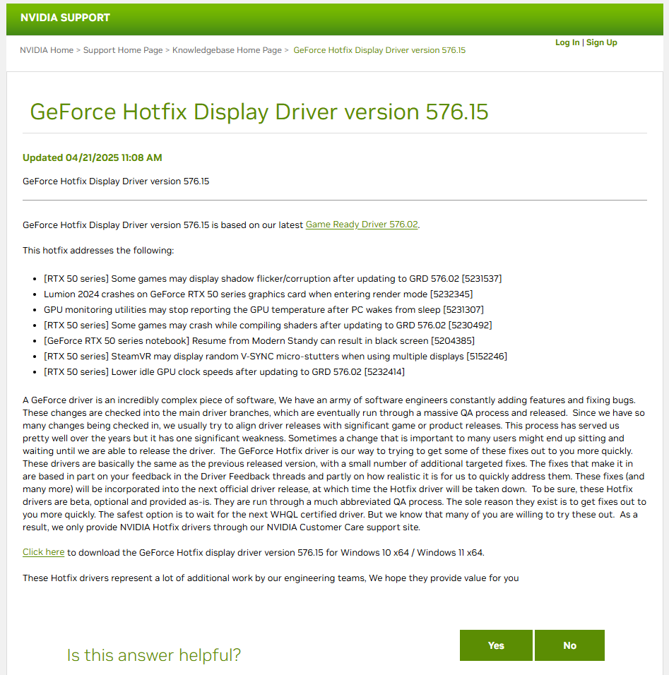 NVIDIA, Geforce 드라이버 576.15 핫픽스 출시 2025.04.22 16:45 PC.Div.Soft/Driver.Firmware 반응형 NVIDIA가 Geforce 드라이버의 핫픽스(576.15)를 진행했습니다. 576.02버전에서 발생하는 RTX 50시리즈 GPU의 깜빡임 문제를 해결하고, 루미온 2024에서의 충돌 문제도 해결한다고 합니다. 이외에도 많은 게임에서의 버그 수정 및 절전 모드에서 깨어날 때 GPU 모니터링을 올바르게 하지 못하고 중지하는 버그 등이 수정되었다고 하니 50시리즈 분들은 업데이트를 챙겨보세요. 반응형 공유하기 게시글 관리 Klein Berry 'PC.Div.Soft > Driver.Firmware' 카테고리의 다른 글 Intel Z890 시리즈 칩셋 머더보드 200S Boost 기능 추가 (0) 2025.04.25 CyberDuck - 무료 FTP/CLOUD DISK 접속기 (0) 2025.04.13 무료 레코딩/ISO 제작 소프트웨어 - ISOBURN (0) 2025.04.08 댓글 공유하기 다른 글 댓글 이 글 공유하기 구독하기 구독하기 카카오톡 카카오톡 라인 라인 트위터 트위터 Facebook Facebook 카카오스토리 카카오스토리 밴드 밴드 네이버 블로그 네이버 블로그 Pocket Pocket Evernote Evernote 다른 글 AJAZZ 159 APEX 마우스 펌웨어 업데이트 AJAZZ 159 APEX 마우스 펌웨어 업데이트 2025.04.25 Intel Z890 시리즈 칩셋 머더보드 200S Boost 기능 추가 Intel Z890 시리즈 칩셋 머더보드 200S Boost 기능 추가 2025.04.25 CyberDuck - 무료 FTP/CLOUD DISK 접속기 CyberDuck - 무료 FTP/CLOUD DISK 접속기 2025.04.13 무료 레코딩/ISO 제작 소프트웨어 - ISOBURN 무료 레코딩/ISO 제작 소프트웨어 - ISOBURN 2025.04.08 다른 글 더 둘러보기