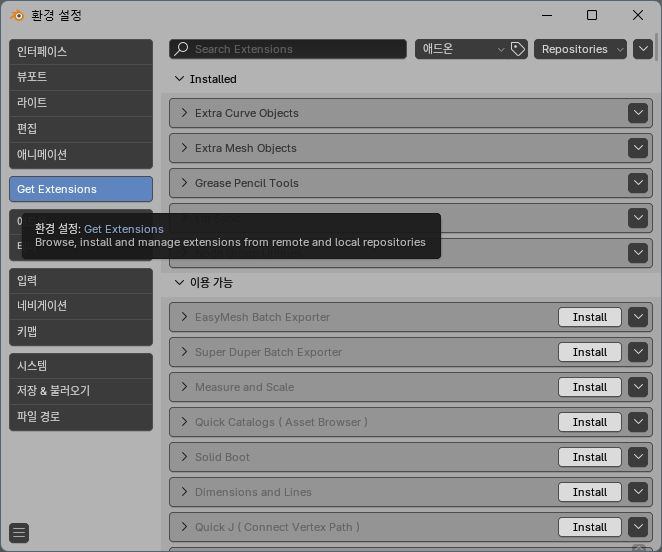 블렌더) 추가 기능 활성화하기 2025.05.07 16:27 Web.World/Tip.Cad.De.3D.Font 반응형 이게 버전이 오르면서 약간씩 메뉴 들어가는 데 차이가 생기긴 하지만 대게 대소동의 하다. 추가 기능은 별도로 설치 가능하지만 환경 설정 > 애드온에서 관리할 수 있다. 또는 Get Extentions 에서 온라인 연결을 활성화하면 검색해서 설치도 가능하니 참조합시다. 메뉴얼 공식에서 되게 상세하게 제공하고 있으니까 메뉴얼 꼭 꼭 읽고 작업하는 습관 가집시다요... 반응형 공유하기 게시글 관리 Klein Berry 'Web.World > Tip.Cad.De.3D.Font' 카테고리의 다른 글 포토샵에서 한 파일 다중 창 열기 (0) 2025.05.14 블렌더 UI 크기 조절하기 (0) 2025.05.06 피그마 공식 홈페이지 강좌 (0) 2025.05.03 댓글 공유하기 다른 글 댓글 이 글 공유하기 구독하기 구독하기 카카오톡 카카오톡 라인 라인 트위터 트위터 Facebook Facebook 카카오스토리 카카오스토리 밴드 밴드 네이버 블로그 네이버 블로그 Pocket Pocket Evernote Evernote 다른 글 어도비 포토샵) 영문 입력 시 대문자로만 보이게 하기 어도비 포토샵) 영문 입력 시 대문자로만 보이게 하기 2025.05.14 포토샵에서 한 파일 다중 창 열기 포토샵에서 한 파일 다중 창 열기 2025.05.14 블렌더 UI 크기 조절하기 블렌더 UI 크기 조절하기 2025.05.06 피그마 공식 홈페이지 강좌 피그마 공식 홈페이지 강좌 2025.05.03 다른 글 더 둘러보기
