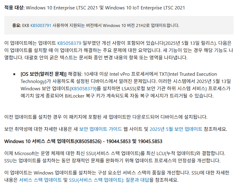 Microsoft가 일부 Windows 10 환경에서 Bitlocker 복구 화면이 반복적으로 표시되는 문제가 있다고 밝혔습니다. 10세대 이상 Intel vPro 지원 CPU와 TXT(Trusted Execution Technology) 기능을 사용하는 환경에서 KB5058379 업데이트를 설치하면 발생한다고 합니다.