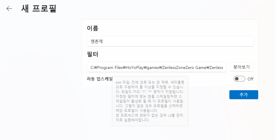 C:\Program Files\HoYoPlay\games\ZenlessZoneZero Game 에서 ZenlessZoneZero.exe 추가, 자동 업스케일은 필요에 따라. 체크하고 추가.