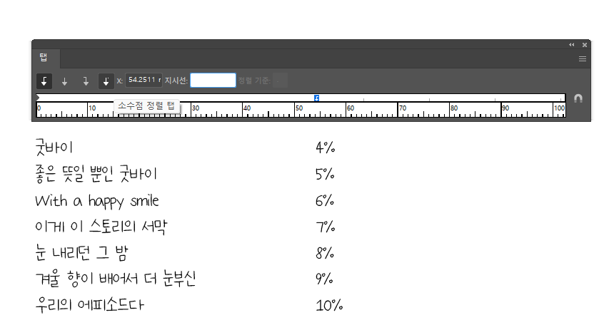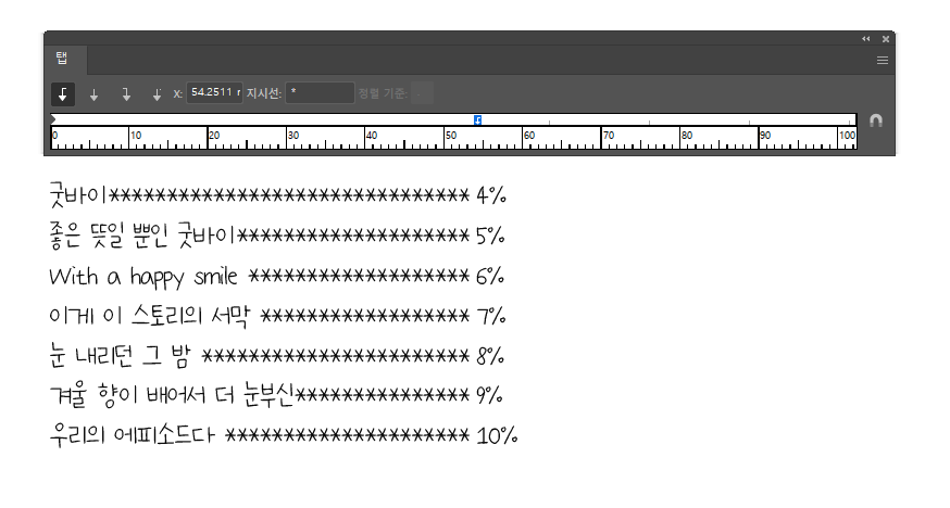 보통은 인디자인 같은 툴로 마무리하니까 일러스트레이터로는 크게 안쓰게 되는데, 일단 문장에서 탭과 관련한 설정을 할 수 있게 된다. 창 메뉴 > 문자 > 탭(SHIFT+CTRL+T) 누르면 창이 뜨고, 내용에 탭만큼 띄울 부분에 키보드 TAB키를 눌러 띄워 둔다.