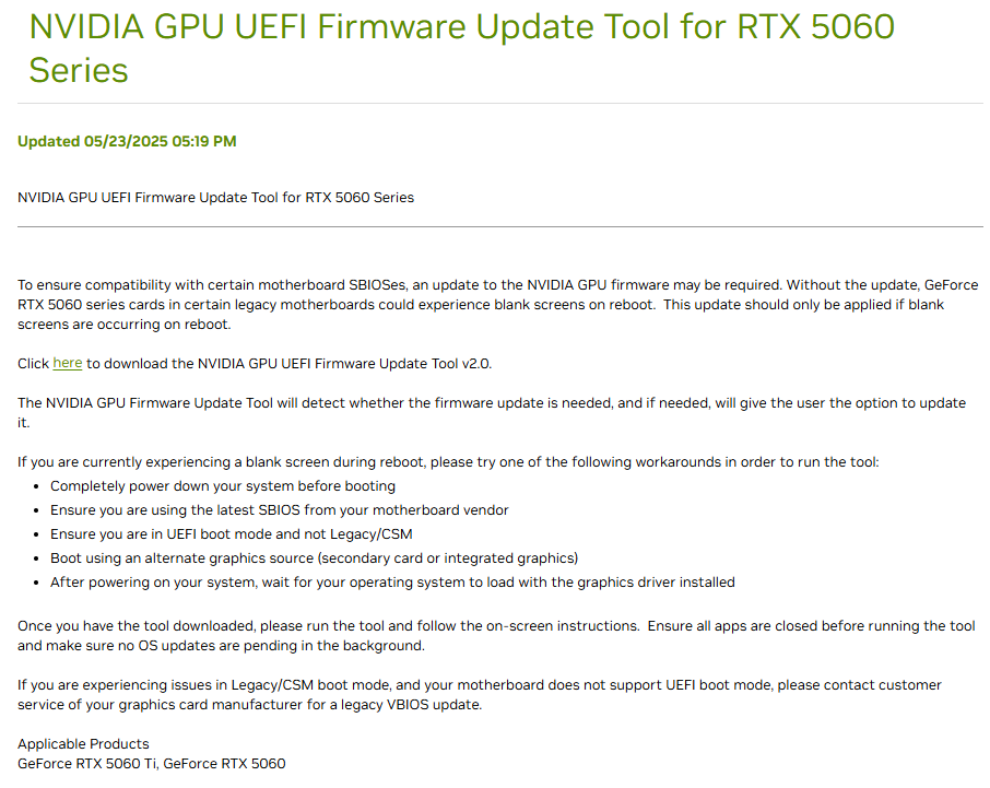 NVIDIA가 RTX 5060 시리즈용 UEFI 펌웨어 업데이트 도구를 출시했습니다. 업데이트 전에 사용하는 머더보드의 BIOS도 미리 업데이트해두시고, 레거시 모드를 사용중이라면 업데이트는 다른 PC에서 하거나 서비스 업체를 이용할 것을 권하네요.